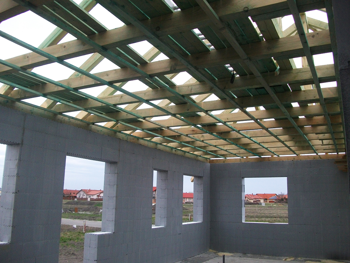 Nem csalatkoztunk: már helyén a hagyományos kontyolt nyeregtető ácsszerkezete is, melyre Megrendelőnk Terrán Synus cserepet választott, meggypiros színben.