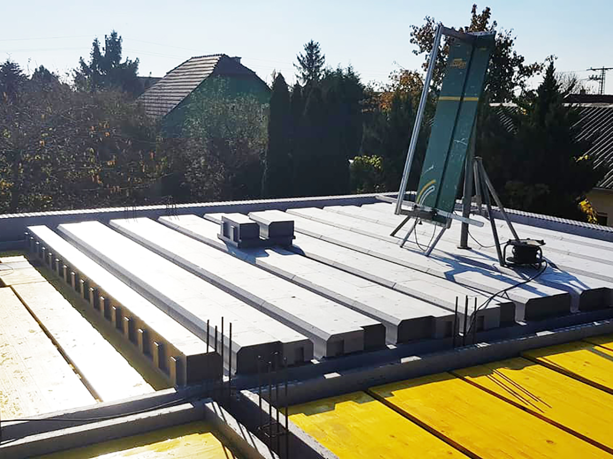Födémszintre értünk a Budapest XVII. kerületében zajló kivitelezésünk helyszínén: új felvételeinken nagyszerűen bemutatják az IsoteQ PASSZÍV koszorút, ami körülöleli a helyükre kerülő IsoteQ PROFESSIONAL födém idomokat.