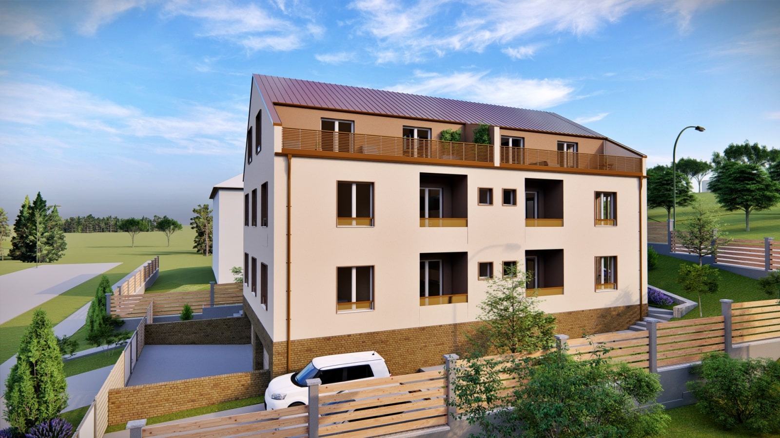 A modern four-storey building with six apartments and a Flat roof.