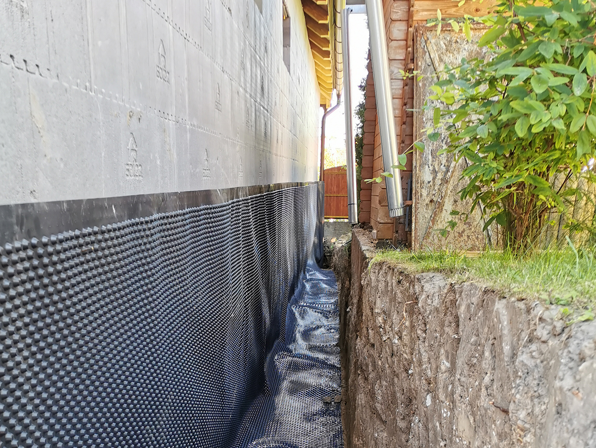 The photos present well the different layers: the greasy insulation material on the plinth surface, the XPS panels and the drainage plate.