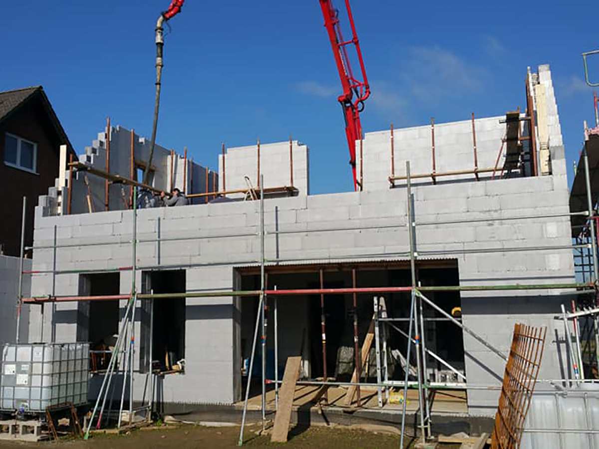 They already concreting the IsoteQ walls of the garage and the attic. It can be clearly seen on the photos and videos, that the concrete can completly fill up our builind elements without any problems, thanks to the plastic inserts. Whole wall sections can be concreted with concrete pump, compared to the earlier form of this technology, where the massive polystyrene inserts stood in the way of concrete.