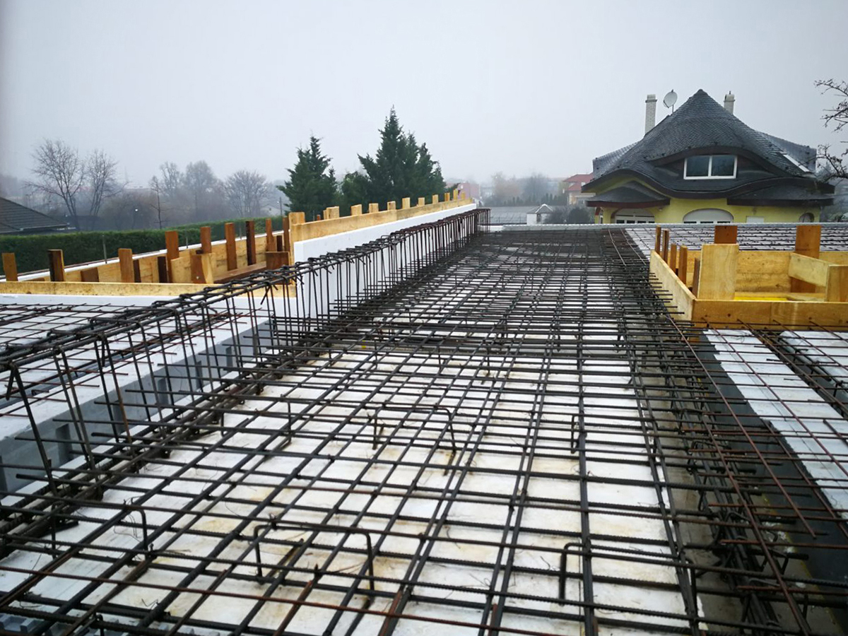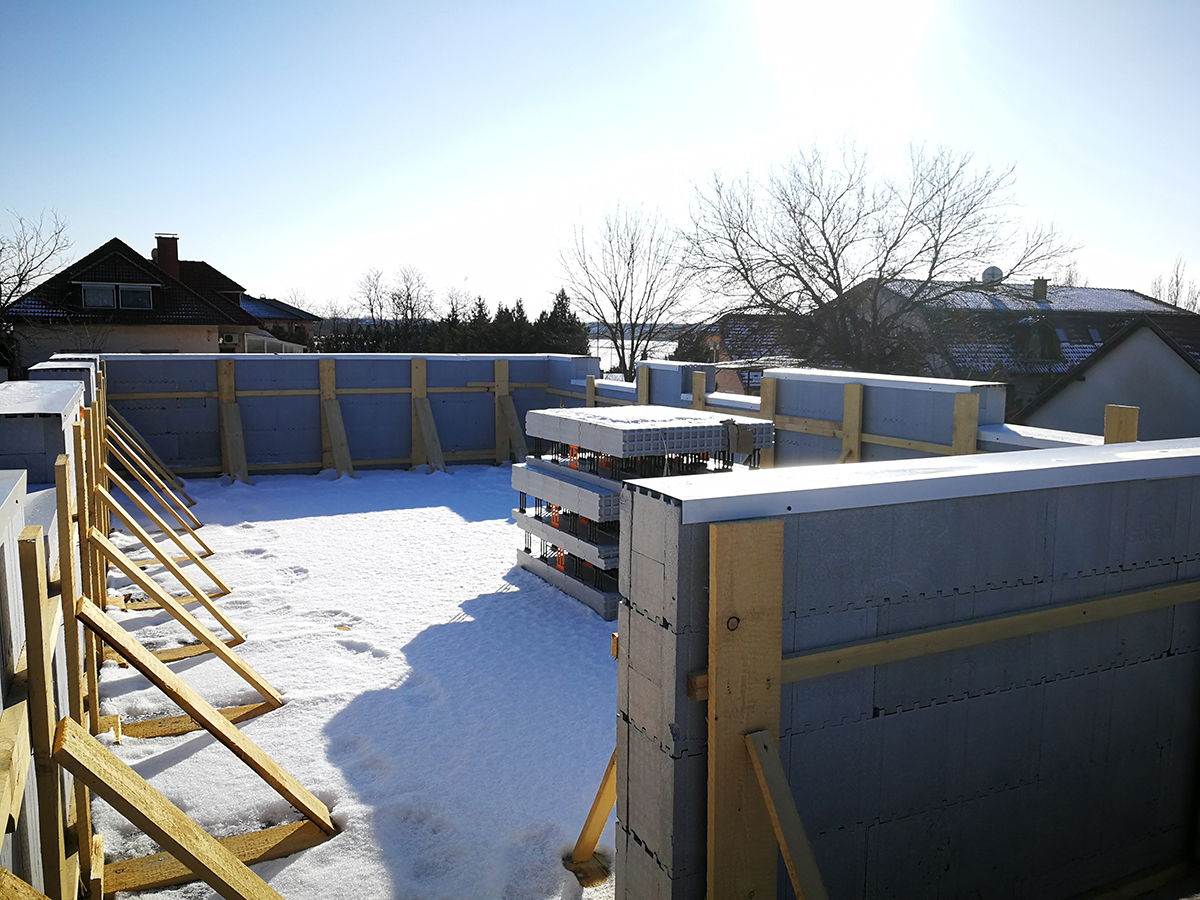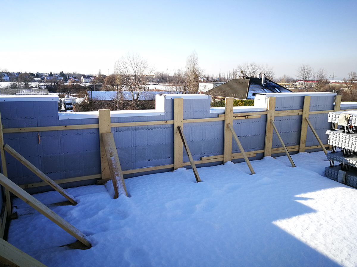 As you can see on the new photos (References page) the construction site is covered with snow. With out technology the construction can go on, even under freezing point, because the NEOPOR insulated concrete form protects the concrete from freezing. In this case, the temperature needed for the concrete to solidify is provided by the bonding of the cement.