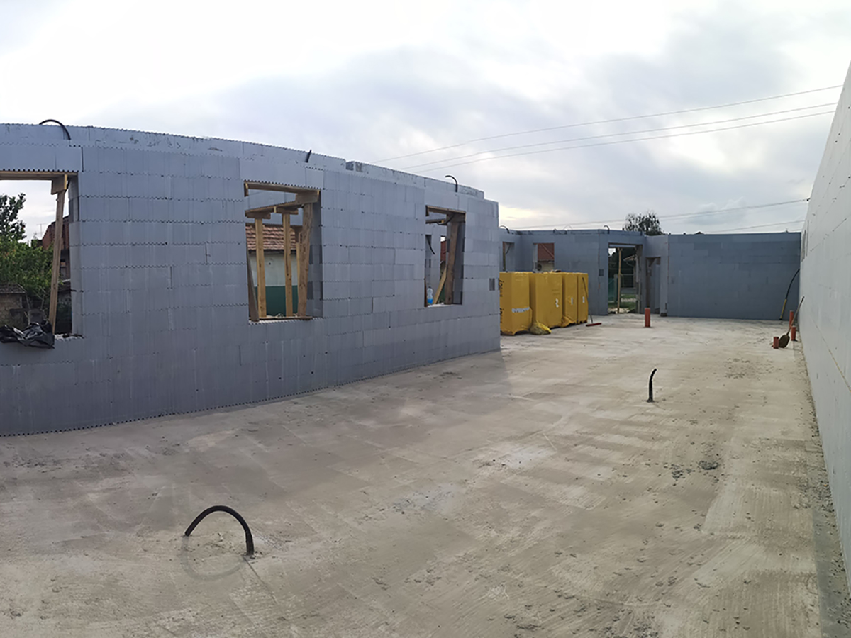The new photos from our Customer show us the progress at the construction at Cegléd. We can see the YTONG inner partition walls and the IsoteQ Lintel and Ring elements above the terrace. The construction of the ceiling will start soon, the support stands are already on their places.
